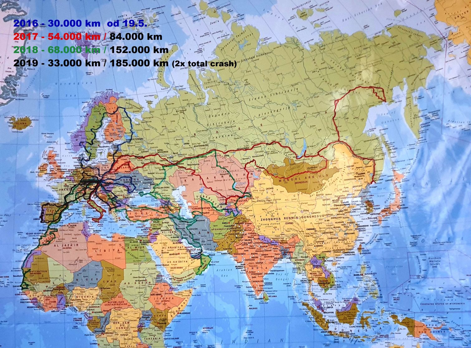 Za ty dosavadní 4 roky jsme toho stihli myslím opravdu hodně. Najezdili jsme více jak 200 000 km a navštívili 59 zemí – celou Evropu, západ Afriky až po Gambii, přes Írán do SAE a Ománu, Pamír, Mongolsko a Rusko až do bájného Magadanu a Vladivostoku, všechno ve dvou na jedné motorce