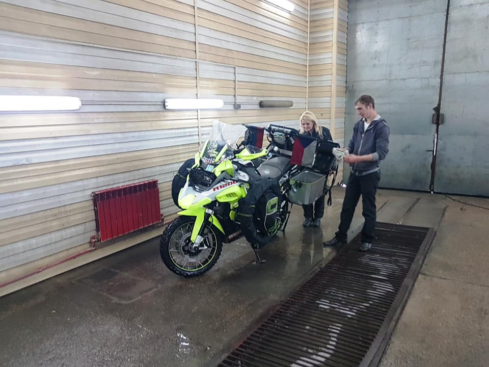 Vyzvedáváme motorku z kůlny, kde ji v noci hlídal mladý Armén - a to doslova, páč si ustlal hned vedle ní. Vyrážíme do města hledat myčku, za chvilku se zadaří a krása zase září. Spěcháme na setkání s Alexejem, bývalým prezidentem MCC Polární Sovy, a domlouváme program na dnešní a další den. Objíždí s námi prodejny moto doplňků – doplňujeme, co nám chybí a co jsme cestou rozbili a pak nás pro dnešní den předává dalším členům klubu. Objíždíme několik zámečnictví a necháváme na zakoupeném zpětném zrcátku přeřezat nový závit, platíme naší samolepkou - peníze opět odmítnuty, ostatně tak jak je tady zvykem.